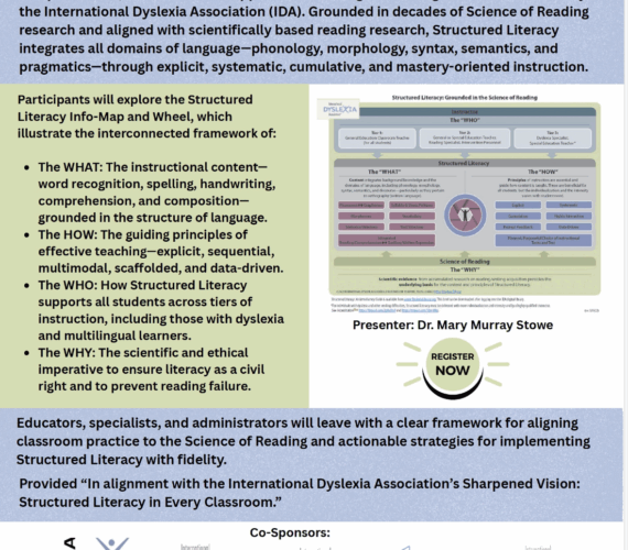 Structured Literacy: Integrating the What, How, Who, and Why of Evidence-Based Reading Instruction Date: December 9, 2025 Time: 6:30pm to 8:00pm Join us for a 90-minute interactive webinar exploring Structured Literacy, the comprehensive, evidence-based approach to reading and writing instruction defined by the International Dyslexia Association (IDA). Grounded in decades of Science of Reading research and aligned with scientifically based reading research, Structured Literacy integrates all domains of language-phonology, morphology, syntax, semantics, and pragmatics-through explicit, systematic, cumulative, and mastery-oriented instruction. Participants will explore the Structured Literacy Info-Map and Wheel, which illustrate the interconnected framework of: The WHAT: The instructional content-word recognition, spelling, handwriting, comprehension, and composition-grounded in the structure of language. The HOW: The guiding principles of effective teaching-explicit, sequential, […]